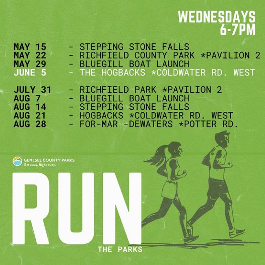 This week’s run/walk will be held at the Hogbacks Area, which has primarily gravel trails: 12282 W. Coldwater Road, Columbiaville.