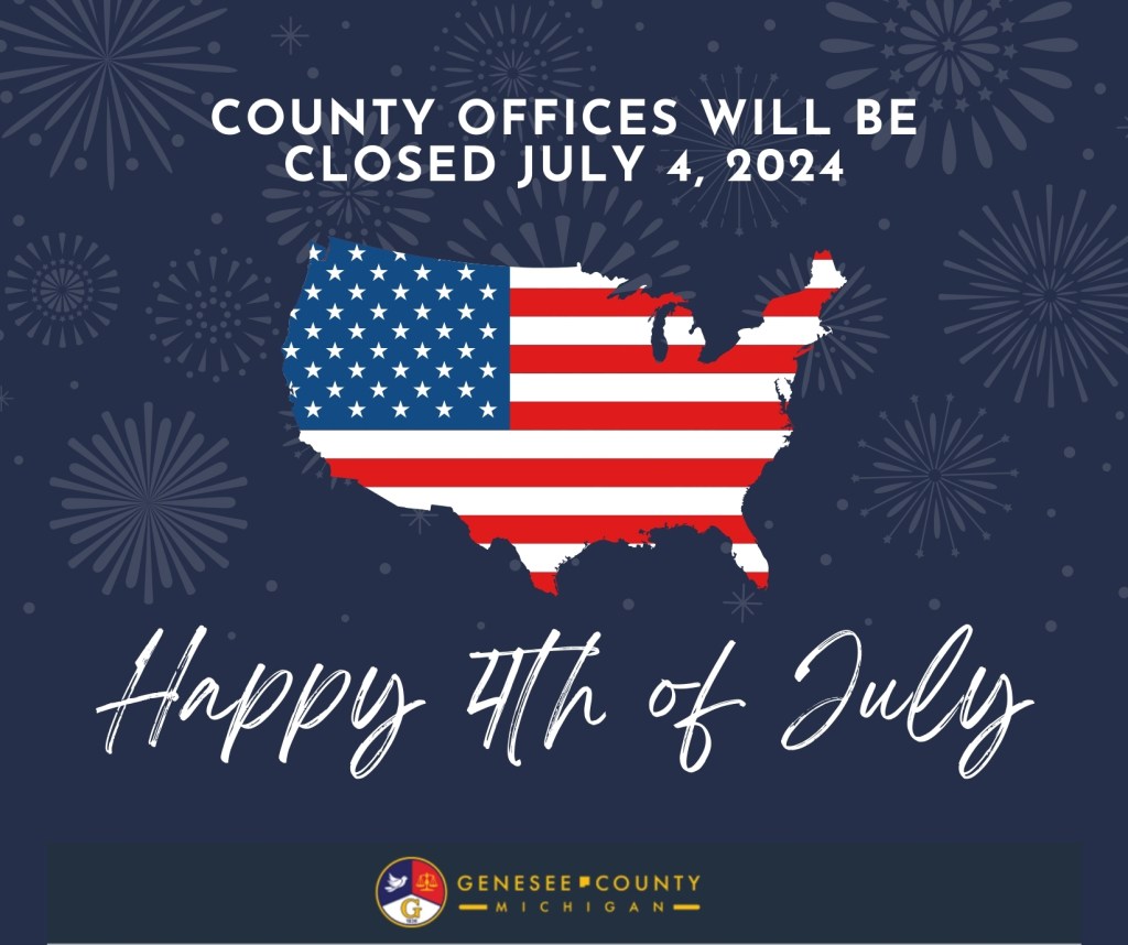 Genesee County offices will be closed for the Fourth of July holiday. Offices will reopen on Friday, July 5.