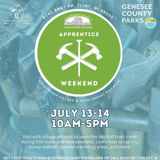 Genesee County, MI — Make plans to join us on the weekend of July 13-14 at Crossroads Village and Huckleberry Railroad for a special make-and-take event! You can learn traditional trades from village artisans, including tin tapping, leather stamping and operating a printing press. This will be a great experience for the whole family!