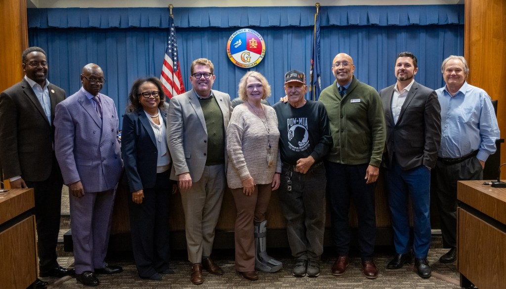 At its regular meeting on Wednesday, November 20, the Genesee County Board of Commissioners honored Mike “Flagman” Bowen of Flushing. Bowen was nominated by Lauren Thompson of the Genesee County Department of Veterans Services (GCDVS) for the Michigan Veterans Affairs Agency’s prestigious Veteran of the Year Award.