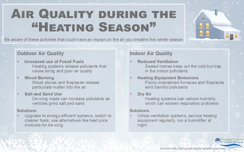 As the winter season approaches, look out for activities that could have an impact on the air you breathe. By being aware of these activities, you can help enhance air quality outside and in your home, and support Genesee County’s priority of healthy, livable and safe communities through environmental stewardship.