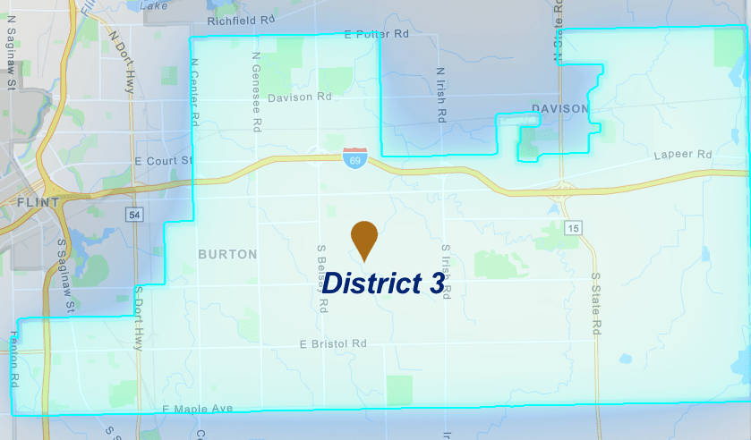 District 3 of Genesee County is represented by Commissioner Gary L. Goetzinger (pictured above). You can reach Commissioner Goetzinger by phone at (810) 516-9941 or by email at GGoetzinger@GeneseeCountyMi.gov.