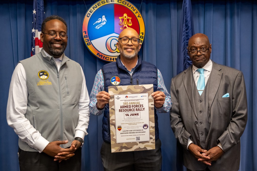 Our Director of Veterans Services, Derrick Britton (center), is pictured with Board of Commissioners Chairman Delrico J. Loyd (left) and Commissioner Charles H. Winfrey. Commissioners Loyd and Winfrey represent Districts 1 and 2, which encompass the City of Flint.
