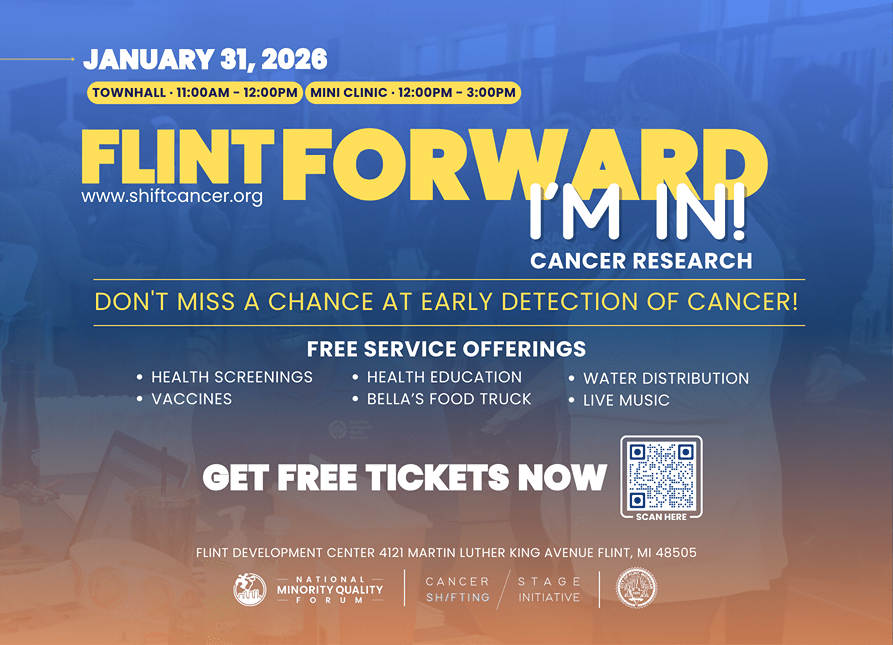 Genesee County, MI — Flint Forward: Community Town Hall and Free Mini Clinic, hosted by the National Minority Quality Forum (NMQF), is coming to Flint on Saturday, January 31. The event represents exactly the kind of proactive, people-centered work that protects the health and wellbeing of Genesee County residents. The Cancer Stage Shifting Initiative of the NMQF has teamed up with Life in 3D and local community partners to meet residents where they are by expanding access to prevention, early detection, and practical health resources in one setting.